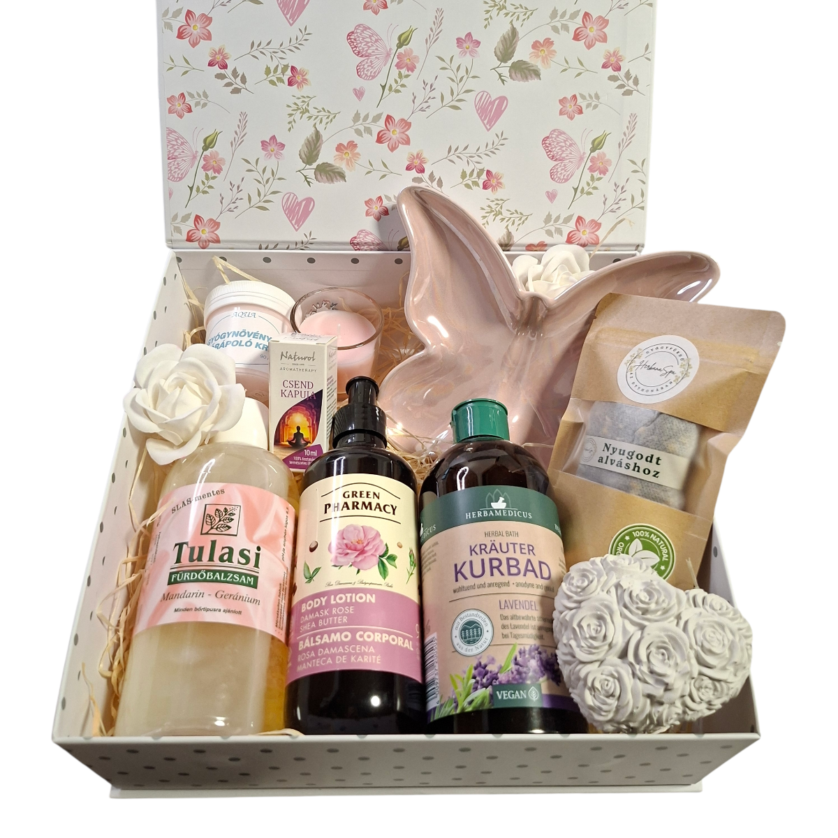 Teremtse meg az esti béke szigetét az Álomszirom ajándékboxszal, amely a természetes gyógynövények és aromaterápiás illatok erejével segíti a testi‑lelki ellazulást. Ez a Kisszünet és Édesálom női összeállítás tökéletes választás a napi stressz levezetésére. A levendulás fürdőkoncentrátum, a damaszkuszi rózsás testápoló és a gyógynövényes kézkrém gyengéden ápolják a bőrt, míg a „Nyugodt alváshoz” gyógynövénykeverék és a Csend Kapuja illóolaj segítenek elcsendesíteni az elmét. A kézzel készült kerámia jellegű kiegészítők, a mécses és a dekoratív szappanrózsa meghitt hangulatot teremtenek, a prémium mágneses doboz pedig elegáns tálalást biztosít.