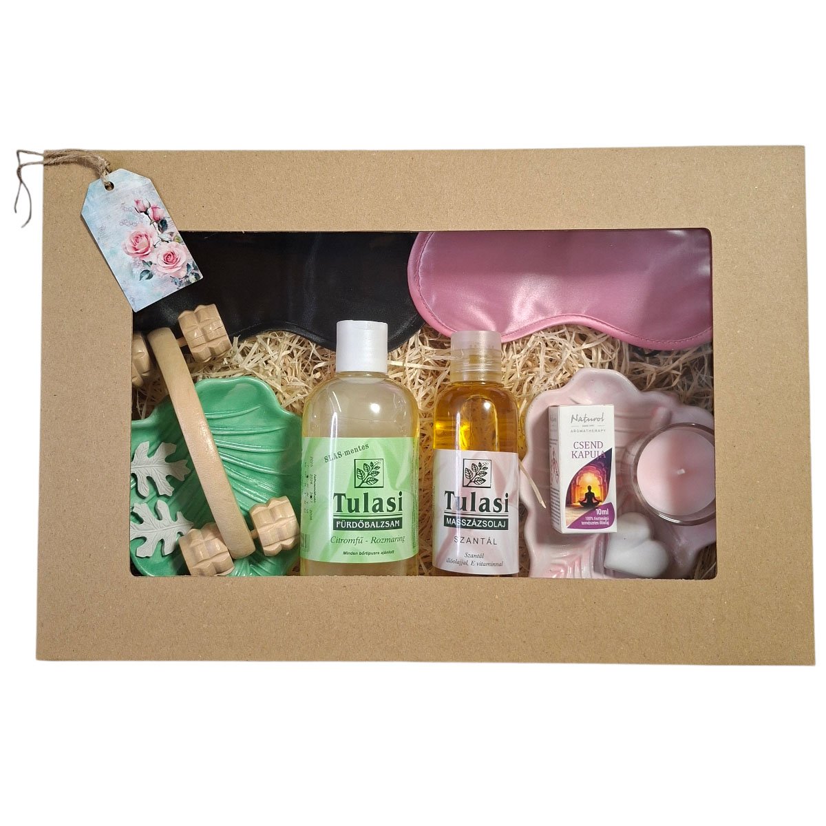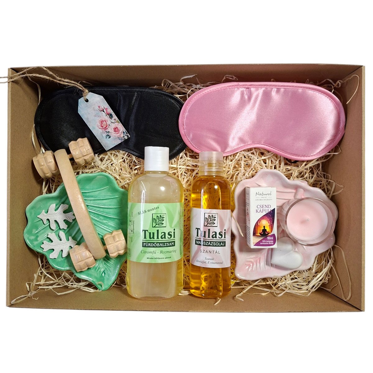 Teremtse meg a tökéletes esti harmóniát az Édesálom Duó ajándékboxszal, amelyet kifejezetten párok számára állítottunk össze. Ez a válogatás a Közöspillanatok jegyében mindkét fél számára kínál kényeztetést: a Tulasi citromfüves–rozmaringos fürdőbalzsam és a szantálos masszázsolaj segít az esti feszültségoldásban. A csomag tartalmaz két selyemhatású alvómaszkot (egy elegáns feketét és egy finom rózsaszínt), hogy a közös pihenés zavartalan legyen. A box különlegessége a kettős aromaterápiás szett: a kézzel készült kerámia jellegű levél tálkák és a 2 db apró aromakő levél a „Csend Kapuja” illóolajjal kiegészítve természetes módon segítik az elalvást. A fa görgős masszírozó és az illatosított gyertya garantálja a spa‑élményt az otthon kényelmében.
