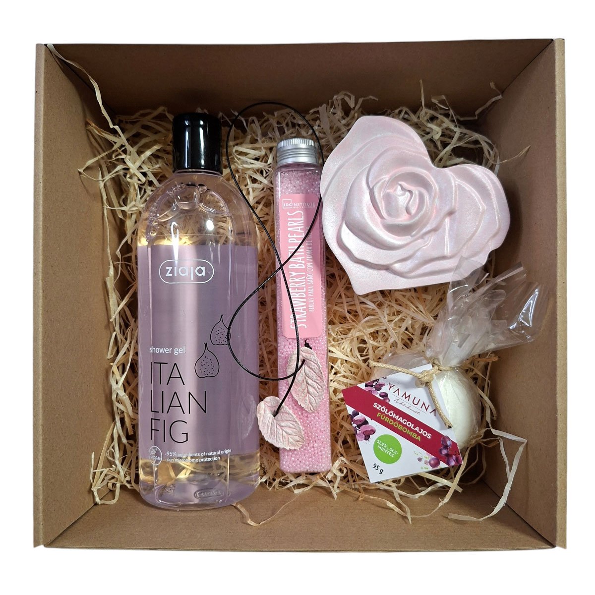 A Gyümölcsfürdő Box egy friss, gyümölcsös hangulatú női ajándékcsomag, amely a pihentető fürdőzés élményét hozza el. A Ziaja Olasz Füge krémtusfürdő természetes illata felfrissíti a testet, a szőlőmagolajos fürdőbomba táplálja a bőrt, az epres fürdőgyöngyök pedig extra kényeztetést adnak. A kerámia jellegű rózsadíszes dobozka dekoratív és praktikus kiegészítője a csomagnak. Tökéletes választás egy kis otthoni feltöltődéshez vagy kedves ajándékként.