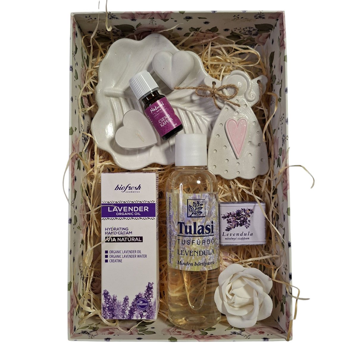 Tapasztalja meg a valódi kényeztetést a Levendula Luxus ajándékboxszal, amely az Édesálom pihentető erejét hozza el otthonába. Ez a  összeállítás a Léleksimogató kategória egyik legigényesebb darabja, melyet a belső béke és a harmonikus Kisszünet megteremtésére alkottunk meg. A csomagban található Biofresh organikus levendulaolajos kézkrém és a Tulasi levendulás tusfürdő a legmagasabb szintű bőrápolást biztosítja. A relaxációt a Naturol „Csend Kapuja” illóolaj és az egyedi, kézzel készült kerámia jellegű kiegészítők teszik teljessé. Elegáns mágneses díszdoboza és kézműves tartalma miatt céges ajándéknak is kiváló választás.